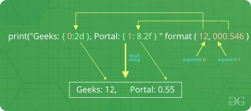 , щоб позначити, де змінна буде замінена, і можуть надати детальні директиви форматування, але користувач також повинен надати інформацію для форматування. Цей метод дозволяє нам об’єднувати елементи в межах виводу за допомогою позиційного форматування. Наприклад -